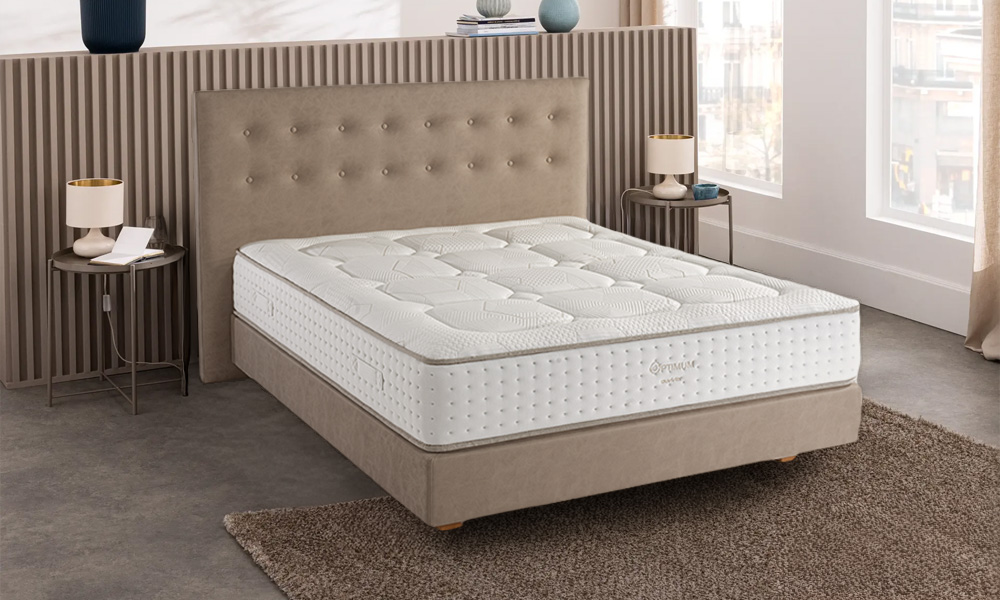 H.29 cm. Accueil doux, soutien équilibré. 750 ressorts ensachés Périplus (en 160×200 cm). Mousse de confort 30 mm Natuflex. Sans carénage mousse. Face de couchage ouate polyester hypoallergénique. Mousse nouvelle génération Airflex. Platebande piquage ultrasons sur ouate 100% recyclable. Coutil 100% polyester. 4 poignées horizontales. Garantie 5 ans.